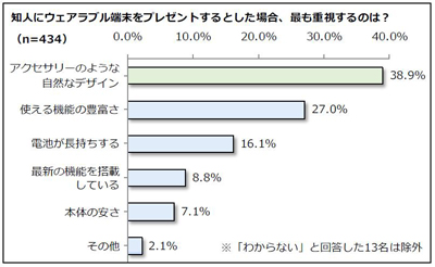 「知人にウェアラブル端末をプレゼントするとした場合、最も重視するポイント」を聞いたところ、「アクセサリーのような自然なデザイン」という回答が38.9%で1位となり、「使える機能の豊富さ」や「電池が長持ちする」などの項目を上回りました。