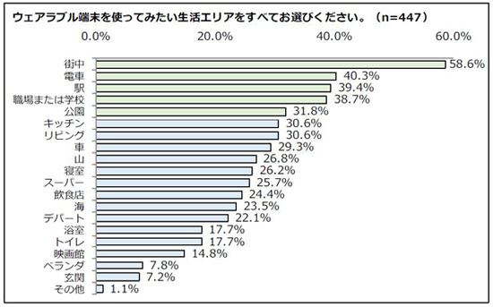 同様に、「ウェアラブル端末を利用したい生活エリア」について聞いたところ、1位「街中」、2位「電車」、3位「駅」、4位「職場・学校」、5位「公園」と、トップ5がすべて外出先という結果になりました。