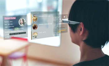 最新のテクノロジーを活用するとどんなサービスが実現できるのか、レストランを題材に実験検証しました。スマートグラスを通じて目の前の空間にAR(※1)メニューを表示・手元のスマートフォンでメニュー表示から会計まで実現・Kinect(※2)で手の動きを認識して注文、といった顧客向けサービスの他、スマートグラスの顔面認証により顧客のプロフィールや過去の注文を表示させる等、店員によるサービス向上を目的とした活用法も紹介しました。