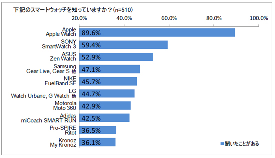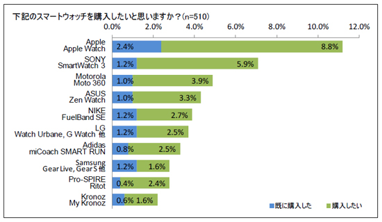 Apple「Apple Watch」/SONY「SmartWatch 3」/NIKE「FuelBand SE」/Pro-SPIRE「Ritot」/LG「Watch Urbane, G Watch他」/Motorola「Moto 360」/Kronoz「MyKronoz」/Samsung「Gear Live, Gear S他」/ASUS「Zen Watch」/Adidas「miCoach SMART RUN」/該当するものがない