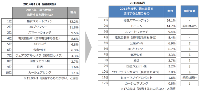 ②2015年後半の流行予測は1位「格安スマートフォン」 ~2位「ドローン」が急浮上~