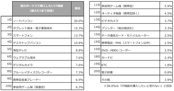 また、夏のボーナスに関してIT機器の購入意向を聞いたところ、1位は「ノートパソコン」で20.0%、2位が「タブレット端末・電子書籍端末」で15.3%という結果でした。注目ITワード1位にランクインした「ウェアラブル端末」の購入意向は7.6%で6位となっています。