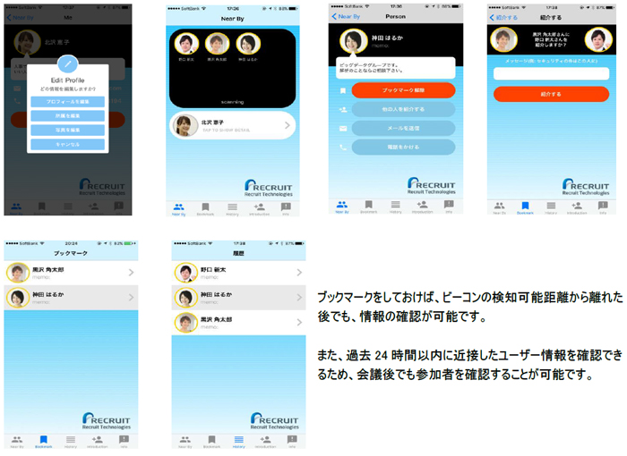 リクルートテクノロジーズの従業員は、自身のプロフィール情報を発信するビーコンを持ち歩くことで、会議などで近くに来た他の従業員のプロフィールを、自身のiPhoneアプリから参照することができます。またこのアプリからメールや電話をすることも可能です。