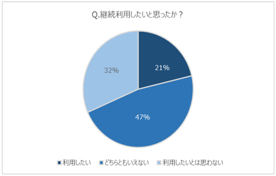 なお、「Q2. 継続利用したいと思ったか?」を聞いたところ、21%が「利用したい」、32%が「利用したいとは思わない」と回答する結果となりました。