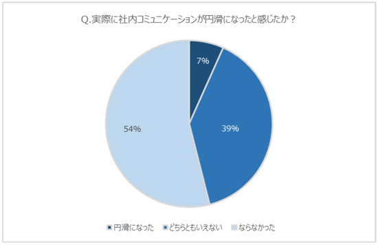 初めに、「Q1. 実際に社内コミュニケーションが円滑になったと感じたか?」と質問したところ、「円滑になった」と回答したのは全体の7%にとどまり、「円滑にならなかった」と回答した54%を下回る結果となりました。今回用意した機能だけでは、「社内コミュニケーションの活性化」を達成するためには不十分だったことがうかがえます。