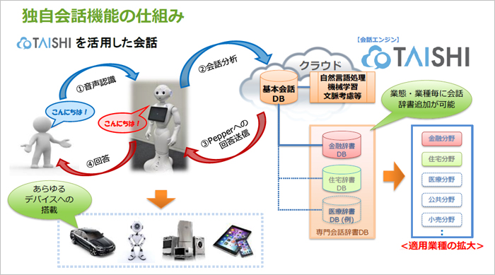 「TAISHI」はクラウド上のデータベースのため、Pepperに限らず、スマートフォンやWebサイトなど、あらゆるデバイスに搭載可能です(※9)。また、基本会話辞書の他に、様々なデータベースを「独自辞書」として付加することにより、会話のレパートリーを自由に拡張することが可能です。今回は、「TAISHI」において金融分野のデータベースを開発、実装しました。専門用語の解説や、質問への回答など、業務に関連する対話を想定した仕様となっています。