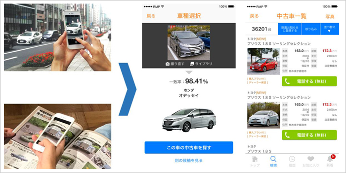 株式会社リクルートマーケティングパートナーズ(本社:東京都中央区、代表取締役社長:山口文洋、以下:リクルートマーケティングパートナーズ)が運営する「カーセンサー中古車検索アプリ」(※1)は、株式会社リクルートテクノロジーズ(本社:東京都千代田区、代表取締役社長:北村吉弘、以下:リクルートテクノロジーズ)が提供する、「ディープラーニングを応用した画像解析機能」を活用し、2016年10月、アプリ内に「画像による車種検索機能」を追加しました。