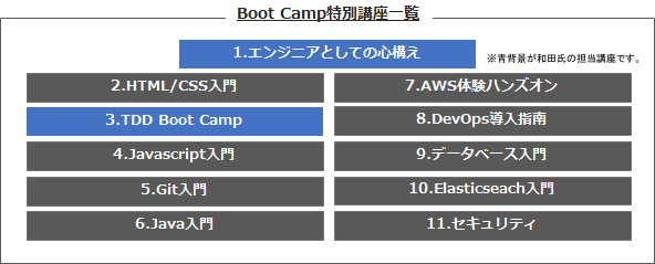 リクルートテクノロジーズでは現在、新入社員を対象に「Boot Camp」と呼ばれる導入トレーニングを実施しています。今年は例年のプログラムに加え、Advance編として下記の11講座を新たに開催。和田氏のほかにも社内トップクラスのエンジニアたちが設計した、実践的なプログラム内容となっています。
