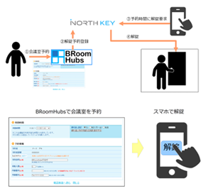 | アークシステムは会議室の有効利用を実現するクラウド型来訪者管理・会議室予約サービス「BRoomHubs」を提供しています。来訪者管理機能やチェックイン・チェックアウト機能など豊富な機能を持つ「BRoomHubs」と「iNORTH KEY」を連携させることでよりセキュリティが高く、効率的な会議室運営が可能になります。 これまで鍵による解錠が必要だった常時施錠の会議室においては、鍵の授受が不要となり、大変便利にサービスをご利用いただけるようになります。 |