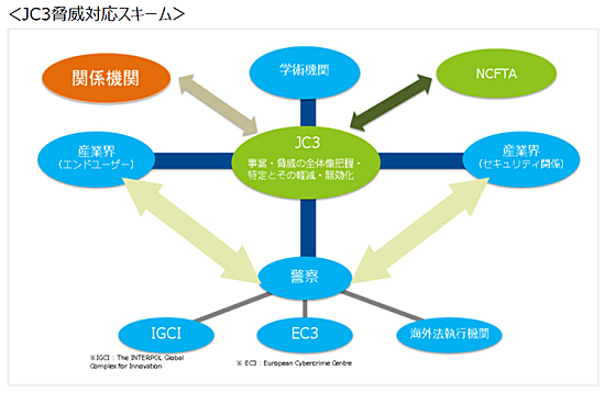 JC3は、産業界、学術研究機関、そして法執行機関がそれぞれの強みを活かすことのできる場を提供し、サイバー空間全体を俯瞰してサイバー空間の脅威の実態を解明することによって、背後に存在する犯罪者らの追跡・特定を図ります。