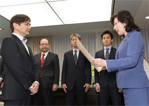 上から、「一般社団法人JPCERTコーディネーションセンター」より贈られた感謝状とトロフィー。野田聖子総務大臣より、「Recruit-CSIRT」代表:鴨志田昭輝に賞状が贈られる様子。