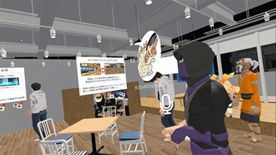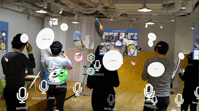 | ■バーチャル側 バーチャル側からは、「基本的に通常のVRルームに入る時と入った時は変わらないが、現実側にいる人と会話できることが面白い」「音声が大事と再認識した」といったコメントがありました。 リアル側の参加者はログインアイコン、バーチャル側同士とプレゼン発表者(HoloLens使用)はアバターで表示・確認されます。 |