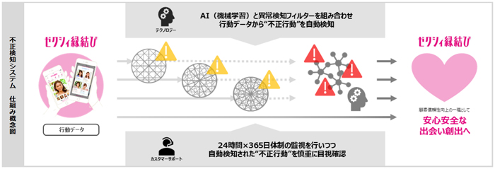 株式会社リクルートテクノロジーズ(本社:東京都千代田区、代表取締役社長:清水淳、以下リクルートテクノロジーズ)は、AIと異常検知フィルターを組み合わせた新たな不正検知システムを開発し、株式会社リクルートマーケティングパートナーズ(本社:東京都品川区、代表取締役社長:山口文洋、以下リクルートマーケティングパートナーズ)が運営する総合婚活サービス『ゼクシィ縁結び』にて、2019年3月4日より運用を開始しました。