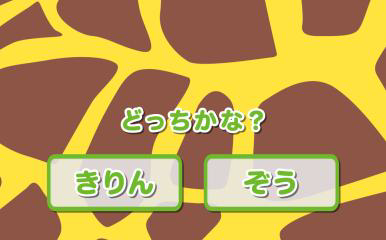 「どうぶつあてゲーム」は、未就学児、小学校低学年を対象としたゲームです。動物の体の一部が拡大される絵を見て、何の動物かを当てます。 2つの選択肢から回答し、問題に正解すると、Pepper が反応します。展開したアプリの中で最も人気の高かったコンテンツで、子どもによっては 30 分程度遊び続けたケースも見られました。
