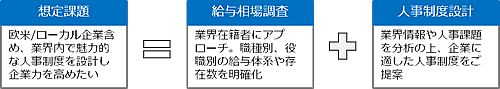 多国籍企業間での人材獲得競争が加熱する中、優秀な人材の採用・定着のためにより具体的な業界・競合の報酬水準を把握して人事戦略を進めたいというご要望が高まっており、本調査サービスを開発いたしました。