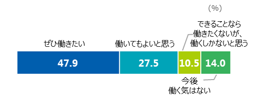在学中の今後の就業意向を聞くと、「ぜひ働きたい」が約半数、「働いてもよいと思う」が3割弱、「できることなら働きたくないが、働くしかないと思う」が約1割だった。特に大学生等の女性は、「ぜひ働きたい」が5割を超えている。