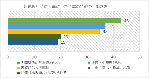 "転職検討時に大事にした企業の特徴や働き方"の上位には「人間関係に気を遣わない」「社長との距離が近い」、「家族的な人間関係」と回答。これらの不安払拭の一助となるようCM制作に至りました。