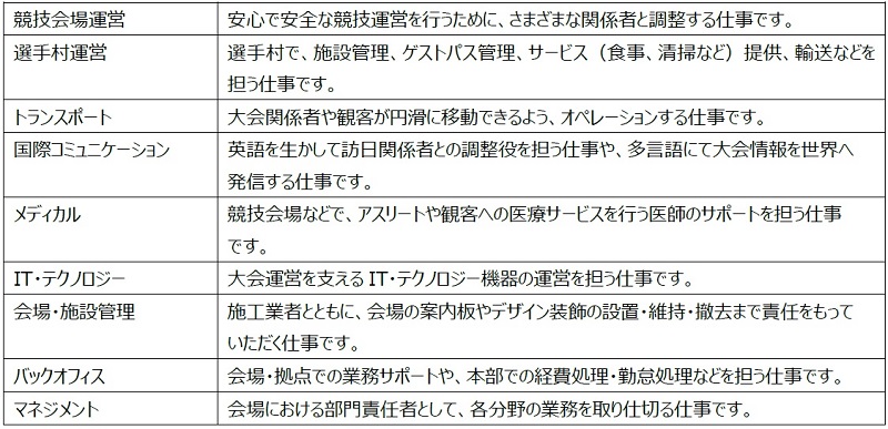 2020年7月24日(金)から9月6日(日)まで開催される東京2020オリンピック・パラリンピックでは、大会を運営する東京2020組織委員会の競技会場・選手村運営や、国際コミュニケーション、会場・施設管理等、さまざまな職種で多くの人材が必要となることが見込まれています。当社は人材サービスカテゴリーのオフィシャルパートナーである株式会社リクルートのグループ会社として、当社が保有する多数の求人情報メディアと、長年培ってきた多様な人材採用の知見・ノウハウを活用し、東京2020組織委員会の採用活動を支援することで、東京2020大会の成功を支えてまいります。