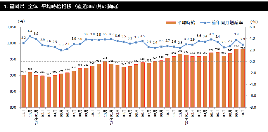 ○福岡県の平均時給は982円 (前年同月954円、前月982円)