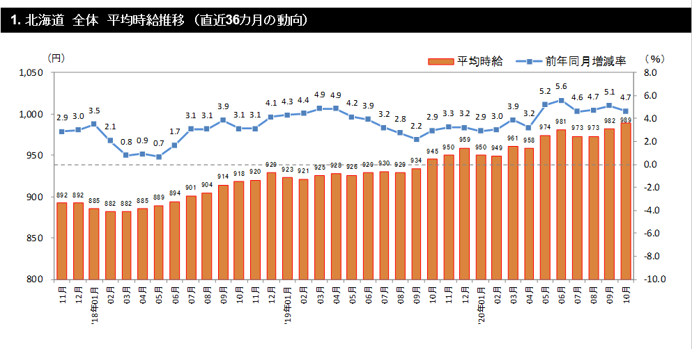 ○北海道の平均時給は989円 (前年同月945円、前月982円)