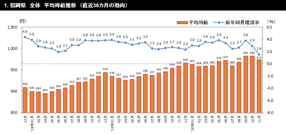 ○ 福岡県の平均時給は974円 (前年同月959円、前月982円)