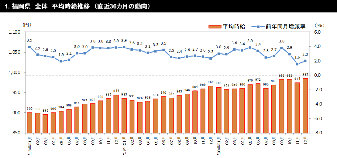 ○ 福岡県の平均時給は985円 (前年同月966円、前月974円)