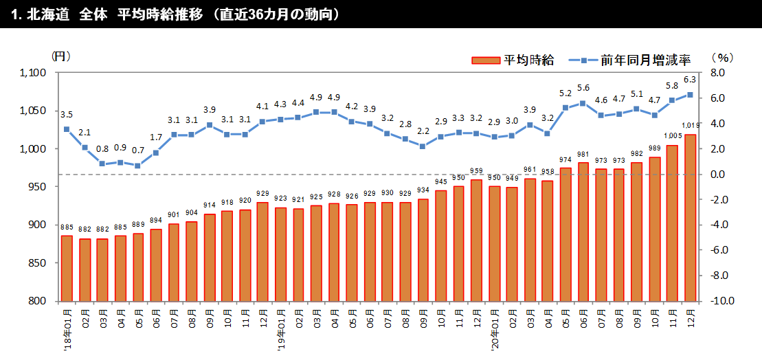 ○北海道の平均時給は1,019円 (前年同月959円、前月1,005円)