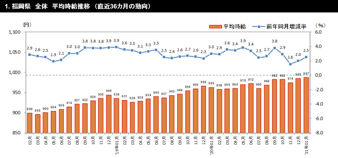 ○福岡県の平均時給は987円 (前年同月963円、前月985円)
