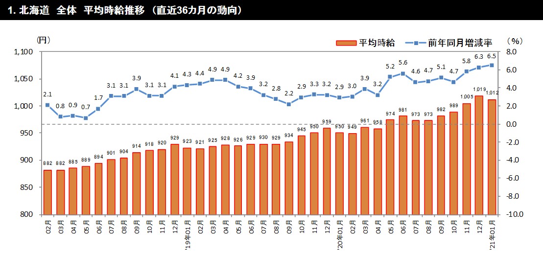 ○北海道の平均時給は1,012円 (前年同月950円、前月1,019円)