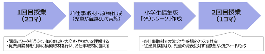 1回目の授業では、従業員講師が自身のキャリアの話を交えつつ、講義とワークを通じて、働く「楽しさ、大変さ、やりがい」を児童に伝えました。児童は授業で学んだことを生かし、一人ひとりが興味のある職業に就いている大人に電話やメール等でお仕事取材を実施。各自が取材した原稿をまとめて小学生編集版「タウンワーク」を作り上げ、2回目の授業では取材を通じて得られた気付きや感想を発表し、従業員講師からフィードバックを行いました。